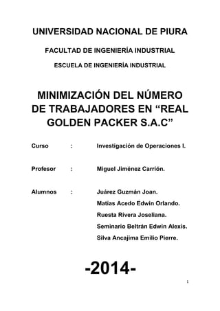 Este documento presenta un estudio para minimizar el número de trabajadores en la empresa "Real Golden Packer S.A.C" mediante el uso de programación lineal. Se recolectaron datos sobre los tiempos de cada proceso productivo para desarrollar un modelo matemático que determine la cantidad óptima de trabajadores requeridos. El objetivo es reducir tiempos muertos y aumentar la productividad. El documento también revisa conceptos sobre programación lineal y presenta la metodología utilizada, que incluye la recolección y análisis de datos para luego plan