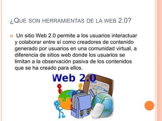 Este documento presenta un trabajo final sobre herramientas de la Web 2.0. Define las herramientas de la Web 2.0 como sitios que permiten a los usuarios interactuar y colaborar como creadores de contenido. Luego describe el origen del término y proporciona ejemplos como wikis, blogs y redes sociales. Finalmente, detalla varias herramientas específicas como Flickr, Quizlet, Google Video y EtherPad.