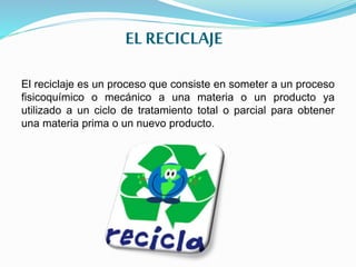 El reciclaje es un proceso que somete materiales ya utilizados a un tratamiento para obtener nuevas materias primas o productos. Existen diferentes contenedores para reciclar plástico, vidrio, cartón, metal y residuos orgánicos. El reciclaje reduce el volumen de residuos, preserva los recursos naturales al reutilizar materiales, y reduce los costos de producción al emplear material reciclado.