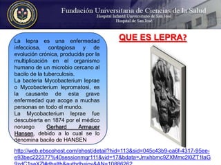 La lepra es una enfermedad causada por Mycobacterium leprae que afecta principalmente la piel y los nervios. Se transmite por contacto próximo y prolongado con una persona no tratada. Los síntomas incluyen manchas en la piel y pérdida de sensibilidad. El tratamiento consiste en una combinación de medicamentos como rifampicina, dapsona y clofazimina. Estudios en Colombia han encontrado evidencia de lepra en zonas endémicas y es necesario mejorar el conocimiento público sobre la enfermedad.