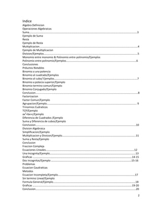 Este documento presenta un trabajo final de álgebra. Explica conceptos básicos como definiciones de álgebra, clasificación de términos y grado de polinomios. Luego describe operaciones algebraicas como suma, resta, multiplicación y división con ejemplos. Finalmente, cubre temas como factorización, ecuaciones de primer y segundo grado, y fracciones complejas. El documento provee una introducción completa a los conceptos y operaciones fundamentales del álgebra.