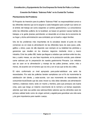 El documento describe un plan de negocios para abrir una pollería llamada "Sabroso Pollo" en la ciudad de Tumbes, Perú. El plan incluye un estudio de mercado para determinar la viabilidad del proyecto, un análisis FODA, y detalles sobre la constitución legal, equipamiento, personal y operaciones necesarios para el éxito del negocio. El objetivo general es satisfacer las necesidades de los clientes ofrec