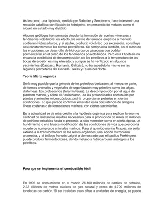 El documento describe la historia y teorías sobre la formación del petróleo. Explica que la ingeniería petrolera combina métodos científicos para descubrir, explotar y procesar los hidrocarburos. También analiza los daños ambientales que puede causar la industria petrolera y los usos comerciales del petróleo como combustible para transporte e industrias.