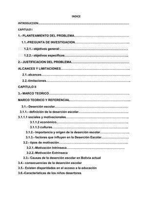 Este documento analiza los factores socioeconómicos que influyen en la deserción escolar en niños del primer ciclo de primaria en la Unidad Educativa "German Bush" en Oruro, Bolivia. Presenta el planteamiento del problema, objetivos de investigar las causas de deserción y su relación con aspectos económicos, sociales y culturales. Justifica la importancia de este tema dado que la deserción afecta el desarrollo de la sociedad y ocurre principalmente por falta de recursos y desintegración familiar. El documento revisa