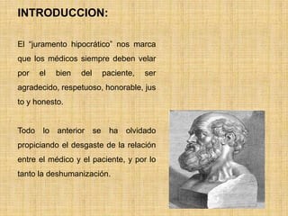 El documento habla sobre la importancia de la relación médico-paciente y los principios éticos de la medicina como la autonomía, beneficencia y no maleficencia. Explica que la deshumanización en la medicina puede causar negligencia médica, maltrato o iatrogenia. Propone cultivar la sensibilidad humana del médico y desarrollar la vocación de servicio a la comunidad para mejorar la atención al paciente.