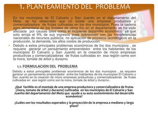 Este documento presenta un estudio de factibilidad para el montaje de una empresa productora y comercializadora de frutas en los municipios de El Calvario y San Juanito en el departamento del Meta, Colombia. El estudio analiza la viabilidad económica del proyecto, incluyendo un estudio de mercado, análisis técnico de la producción, y proyecciones financieras. El objetivo es fortalecer la cadena productiva de frutas en la región y generar alternativas económicas sostenibles para las familias locales.