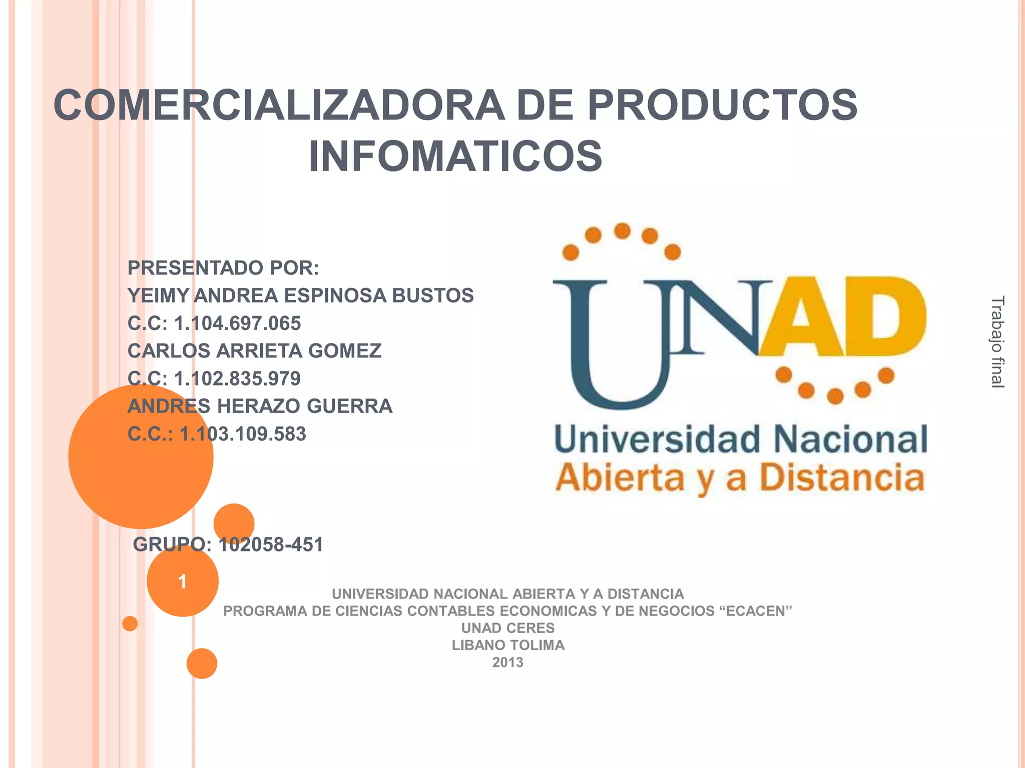 Este documento presenta el diseño de un proyecto para una empresa comercializadora de productos informáticos en Sincelejo, Colombia. El proyecto busca ofrecer servicios de soporte técnico, mantenimiento y reparación de equipos, así como asesoría en software y diseño web. Se realizaron estudios de mercado, técnicos y financieros para evaluar la viabilidad del proyecto. El estudio concluye que el proyecto podría satisfacer una necesidad en la ciudad y generar empleo.