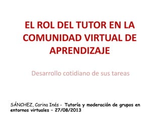 El documento describe el rol del tutor en una comunidad virtual de aprendizaje. Explica que el tutor debe estructurar, organizar, dar seguimiento y mantener activa la comunidad, centrándose en las necesidades de los estudiantes. También debe guiar discusiones, facilitar el intercambio de información, ayudar a construir conocimiento de forma colaborativa, y convertirse gradualmente en un asesor a medida que los estudiantes adquieren más autonomía. El objetivo final es ayudar a la comunidad a consolidarse y evolucionar a través