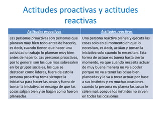 Este documento contiene información sobre actitudes proactivas vs reactivas, liderazgo vs ser jefe, y la importancia de la actitud y los modales al tratar de conseguir algo. Compara personas proactivas que planean bien sus acciones con personas reactivas que solo actúan cuando es necesario. Explica que los líderes inspiran a los demás a mejorar mientras que los jefes dan órdenes. Finalmente, señala que tener buenos modales es más efectivo para conseguir algo que actuar de forma agresiva.