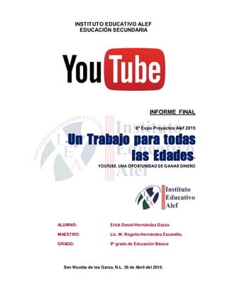 Este documento presenta un informe final sobre un proyecto escolar realizado por un estudiante de noveno grado titulado "Un trabajo para todas las edades" que explora cómo YouTube puede usarse para ganar dinero. El documento explica qué es YouTube, su historia y ejemplos de youtubers famosos, y cómo los creadores de contenido pueden ganar dinero a través del programa de asociados de YouTube. El producto final del proyecto fue la creación de un canal de YouTube y la conclusión es que YouTube ofrece una plataforma para compartir intereses y hab