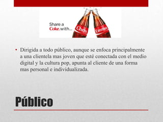 Coca Cola dirige su publicidad principalmente a un público joven conectado digitalmente. Sus anuncios se caracterizan por evocar emociones positivas como la felicidad y el bienestar a través de la manipulación sentimental. A lo largo de los años, Coca Cola ha mantenido elementos visuales constantes como su botella característica y su logotipo en tipografía Spencerian script, creando una fuerte identidad de marca que la ha posicionado exitosamente en el mercado.