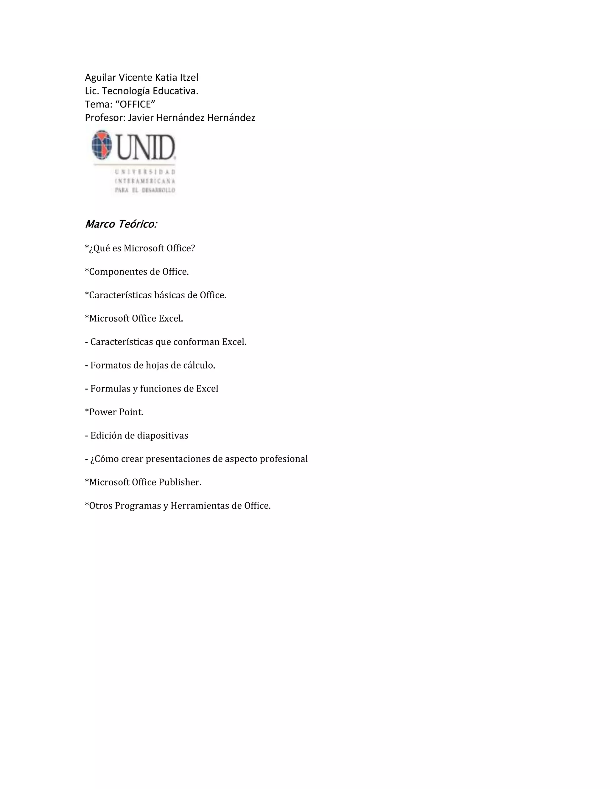 El documento proporciona una introducción general a Microsoft Office, incluyendo sus componentes principales como Word, Excel, PowerPoint, Outlook y Publisher. Explica brevemente las características de cada aplicación y cómo crear y editar documentos, hojas de cálculo, presentaciones y publicaciones. También cubre temas como formatos, fórmulas, funciones, edición de diapositivas y otras herramientas como OneNote y Groove.