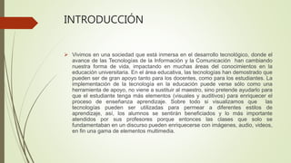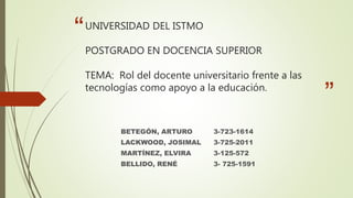 Este documento discute el rol del docente universitario frente a las tecnologías como apoyo a la educación. Explica que los docentes deben ser facilitadores del aprendizaje en lugar de la única fuente de información, y deben usar plataformas de aprendizaje en línea y herramientas multimedia para enriquecer las clases. También destaca la importancia de que los docentes se capaciten en el uso de la tecnología, planeen sus cursos efectivamente, y se adapten a ser guías en entornos de aprendizaje virtual.