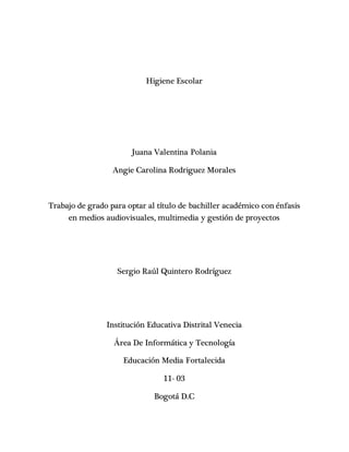 El trabajo de grado de Juana Valentina Polania y Angie Carolina Rodríguez aborda la importancia de la higiene escolar en la institución educativa Venecia, enfocándose en concientizar a los estudiantes sobre el uso adecuado de los implementos de aseo y la creación de un ambiente más saludable. Se explora la historia y clasificación de la higiene, así como estrategias para mejorar el aseo en la escuela, incluyendo la instalación de dispensadores de jabón y papel higiénico. El proyecto busca no solo prevenir enfermedades, sino también educar a la comunidad sobre la relevancia de mantener buenas prácticas de higiene personal y colectiva.