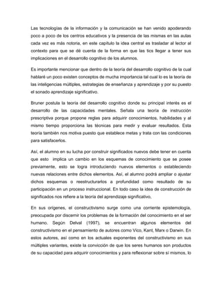 Este documento describe las implicaciones del uso de las tecnologías de la información y la comunicación (TICs) en el desarrollo cognitivo de los estudiantes de bachillerato en la Universidad Autónoma de Sinaloa. Explica teorías del desarrollo cognitivo como las de Piaget, Bruner y Ausubel, así como conceptos como el aprendizaje significativo y las estrategias de enseñanza. Finalmente, señala que aunque el uso de las TICs en los estudiantes es cada vez mayor, su impacto en el desar