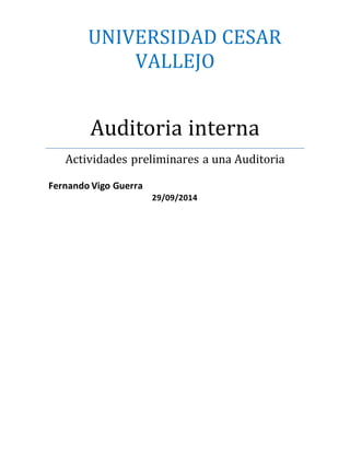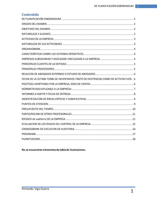 Este documento presenta el plan de auditoría interna de la empresa ALMAPOL SRL. Se describen los objetivos, alcance y actividades preliminares de la auditoría, incluyendo la descripción de la empresa, clientes, proveedores, normatividad aplicable, áreas críticas, riesgos, cronograma y equipo de auditoría.