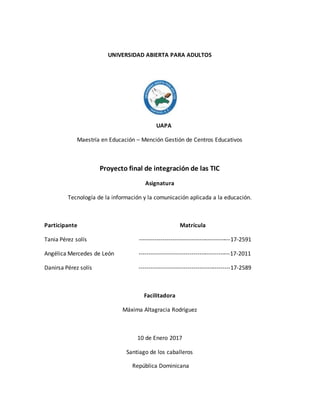 Este documento presenta una propuesta para integrar las tecnologías de la información y la comunicación (TIC) en una escuela en la República Dominicana. Actualmente el uso de TIC es limitado en la escuela debido a falta de equipos y energía eléctrica. La propuesta incluye capacitar a maestros en el uso de TIC, desarrollar actividades pedagógicas que incorporen TIC, y facilitar el aprendizaje de estudiantes mediante el uso de recursos tecnológicos.