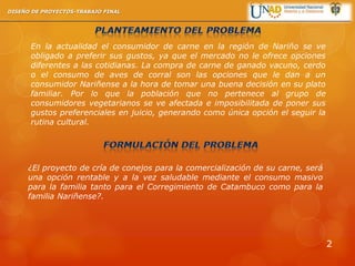 El documento presenta un estudio de factibilidad para un proyecto de cría y comercialización de conejos en el Corregimiento de Catambuco, Nariño, Colombia. El proyecto busca mejorar la calidad de vida de las familias locales a través de la creación de empleo y el suministro de una fuente de proteína saludable. Se realizaron estudios de mercado, técnico, financiero y legal para determinar la viabilidad del proyecto.