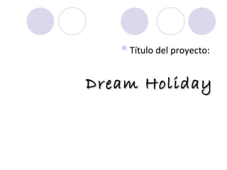 Este documento describe un proyecto educativo en el que los estudiantes planifican sus vacaciones ideales. Primero investigan un destino, luego crean una presentación de PowerPoint e incluyen detalles de su viaje. Más adelante comparten sus presentaciones en redes sociales para recibir comentarios de sus compañeros. El objetivo es que practiquen inglés y trabajen en equipo de forma creativa y segura a través de la tecnología.