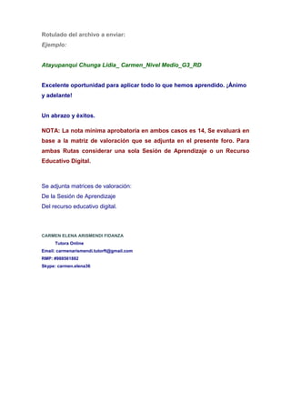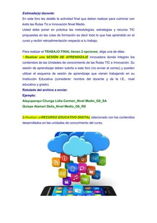 Este documento proporciona instrucciones para la tarea final de un curso sobre Tecnologías de la Información y la Comunicación e Innovación a nivel medio. Los estudiantes deben demostrar lo aprendido creando ya sea una sesión de aprendizaje innovadora que integre los contenidos del curso o un recurso educativo digital relacionado con los temas. La tarea será evaluada con una nota mínima de 14 basada en las matrices de valoración adjuntas.
