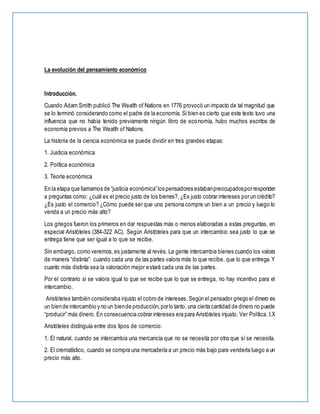 El documento presenta un resumen de la evolución del pensamiento económico dividido en tres etapas: 1) Justicia económica, preocupada por conceptos como el precio justo. 2) Política económica, con los mercantilistas enfocados en enriquecer países. 3) Teoría económica, con Adam Smith y la escuela clásica defendiendo los mercados libres. Explica las contribuciones de pensadores como Aristóteles, Santo Tomás de Aquino, los escolásticos y los clásicos.
