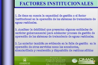Este documento trata sobre los sistemas de tratamiento de aguas residuales en Colombia. Presenta algunos sistemas como reactores anaeróbicos y lagunas de maduración, destacando sus ventajas y desventajas. También analiza los factores sociales, económicos, técnicos, culturales, ecológicos, políticos y legislativos que afectan la implementación de estos sistemas, resaltando la importancia de políticas y leyes acordes a las necesidades comunitarias para mejorar el tratamiento de aguas residuales.