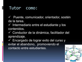 Este documento presenta el rol del tutor virtual y las funciones y habilidades requeridas. El tutor actúa como puente de comunicación, orientador y facilitador del aprendizaje. Sus funciones incluyen el apoyo psicosocial y académico a los estudiantes, así como la organización del curso. Una tutoría efectiva requiere habilidades de comunicación, conocimientos sobre educación en línea y actitudes de compromiso y empatía.