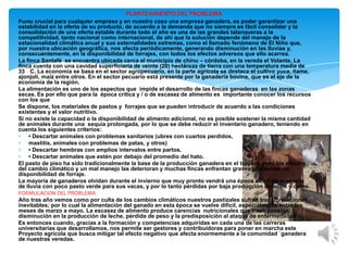 Este documento presenta un proyecto para mitigar los efectos negativos de la escasez de alimentos para el ganado durante la época seca en la finca Santafé. Propone capacitar a los ganaderos en técnicas de conservación, almacenaje y transformación de forrajes, así como el uso de suplementos alimenticios para mejorar la producción. Incluye un análisis de la situación actual, objetivos de proveer alternativas de alimentación, y estudios de mercado, técnico y financiero para la implementación del proyecto en la
