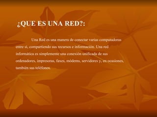 Una red es una conexión entre varias computadoras que permite compartir recursos e información. Existen dos tipos principales de redes: redes de difusión donde todos reciben la misma información, y redes de punto a punto donde la información viaja entre pares de máquinas. Las redes también se clasifican por su alcance geográfico, desde redes locales dentro de un edificio hasta redes más amplias que se extienden entre ciudades o a nivel global.
