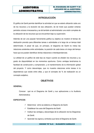 El documento describe el diagrama de Gantt y su aplicación en la auditoría administrativa. Explica que el diagrama de Gantt fue desarrollado por Henry Gantt y permite visualizar el tiempo dedicado a diferentes tareas y actividades de un proyecto a lo largo del tiempo. También describe cómo se elabora un diagrama de Gantt, sus ventajas y desventajas, y cómo puede usarse para programar y dar seguimiento a las actividades de un proyecto de auditoría administrativa.