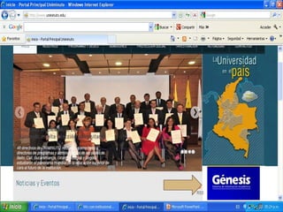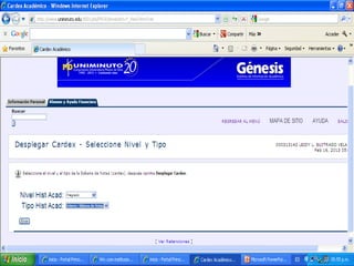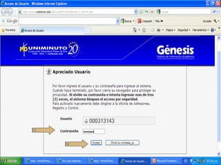 La Corporación Universitaria Minuto de Dios ofrece educación superior de calidad a través de programas virtuales y a distancia con el objetivo de transformación social y desarrollo sostenible. Su misión es brindar educación accesible y flexible mediante alianzas interinstitucionales. Su visión para 2012 es ser reconocida por su contribución al desarrollo del país, la calidad de sus programas y su impacto en la cobertura educativa a través de múltiples sedes. Su reglamento estudiantil establece derechos, deberes y normas