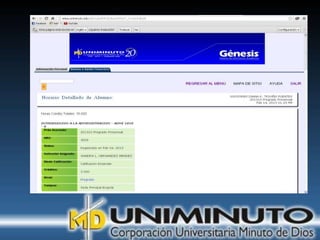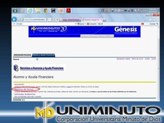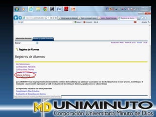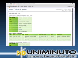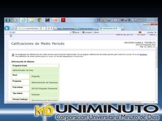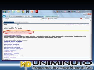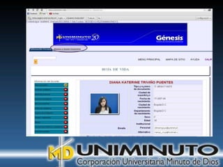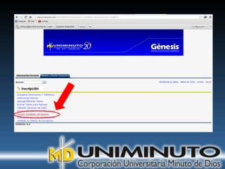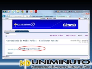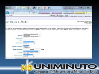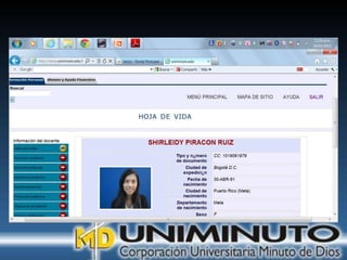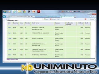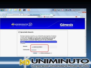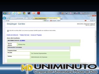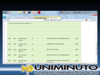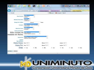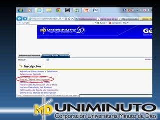 El documento presenta información sobre la misión, visión y modalidades de formación de la Universidad UNIMINUTO. Su misión es ofrecer educación superior de calidad y formar profesionales éticos para construir un país justo. Su visión para 2012 es ser reconocida por su enfoque espiritual, su contribución al desarrollo a través de la educación y la calidad de sus programas. Ofrece educación presencial y a distancia de manera flexible.