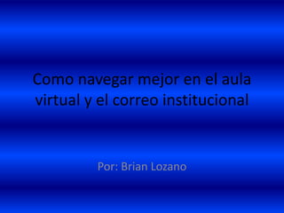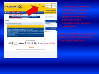 El documento ofrece instrucciones para navegar el aula virtual y correo institucional de la universidad. Primero, se debe acceder a la página de pregrado y dar clic en "aulas virtuales" e ingresar el ID y contraseña de Génesis. Luego se puede actualizar la información personal, participar en foros, comunicarse con compañeros y docentes a través de mensajes, acceder a tareas pendientes, y revisar el correo institucional ingresando a la URL estudiantes.uniminuto.edu. Finalmente, se explica
