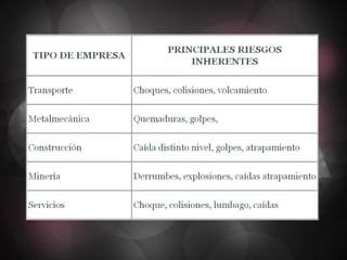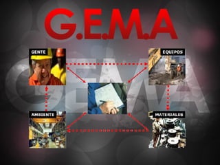 Este documento habla sobre la prevención de riesgos en el lugar de trabajo. Explica que todo proceso productivo involucra cuatro elementos clave: gente, equipo, materiales y ambiente (GEMA). Cada uno de estos elementos puede contribuir a accidentes si no se gestionan adecuadamente. También distingue entre incidentes y accidentes, y cómo el análisis de incidentes puede ayudar a prevenir accidentes. Finalmente, concluye que mantener una relación armoniosa entre los elementos GEMA es fundamental para prevenir riesgos en el lugar de trabajo.