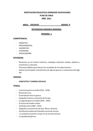 Este documento presenta el plan de estudios del área de ciencias sociales para el grado 9 de una institución educativa en Colombia. El plan describe los objetivos y unidades temáticas para cada uno de los 4 períodos académicos, así como los recursos, bibliografía e indicadores de logro y formas de evaluación. Los temas incluyen conflictos mundiales, diversidad cultural, procesos políticos, economía global y conservación ambiental.