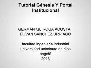 Este documento presenta la misión, visión y política de calidad de la Universidad Minuto de Dios, la cual busca ofrecer educación superior de calidad formando estudiantes con valores. Incluye también secciones sobre el reglamento estudiantil con aspectos como inscripciones, inasistencias y cómo afectan las calificaciones. Por último, presenta tutoriales sobre cómo cambiar contraseñas, ver horarios, notas y cómo inscribirse en materias usando el portal Genesis.