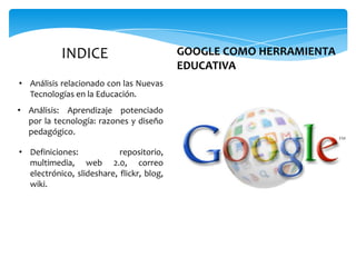 El documento describe las herramientas de Google que pueden usarse en la educación. Explica cómo Google puede usarse para la gestión, investigación y docencia, proporcionando definiciones de términos como repositorio, multimedia, correo electrónico y wiki. También analiza variables como las evolutivas, fisiológicas y culturales que deben considerarse al implementar tecnologías nuevas.