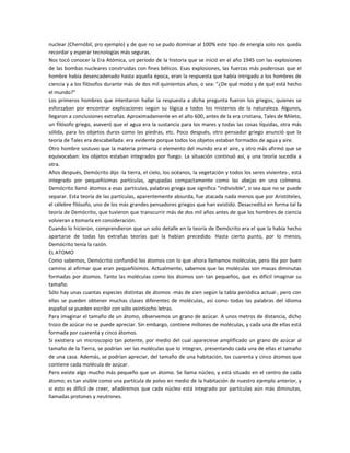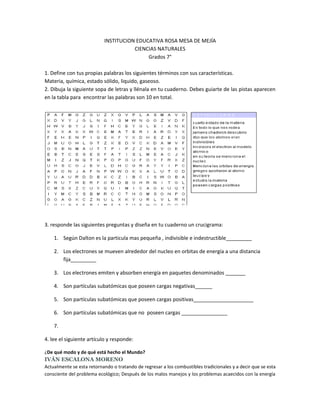 Este documento presenta información sobre ciencias naturales para grados 7°, incluyendo definiciones de materia, química, estados de la materia y sus características. También incluye una sopa de letras con 10 palabras relacionadas al tema y preguntas sobre átomos, electrones, protones y neutrones para completar un crucigrama. Finalmente, presenta un artículo sobre la historia de las teorías para explicar la composición del mundo y la importancia del átomo en la producción de energía.