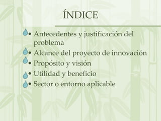 El documento presenta un proyecto de innovación para diseñar un macro purificador de agua aplicable en Lima. El proyecto busca proveer agua de calidad a bajo costo para hogares, instituciones y zonas alejadas mediante un sistema basado en Nikken que purifique el agua de manera simple y eficiente. El equipo de 5 estudiantes, liderado por el ingeniero Carlos Saavedra, justifica la necesidad del proyecto debido a los problemas de calidad y costo del agua en Lima y su visión de fomentar un enfoque