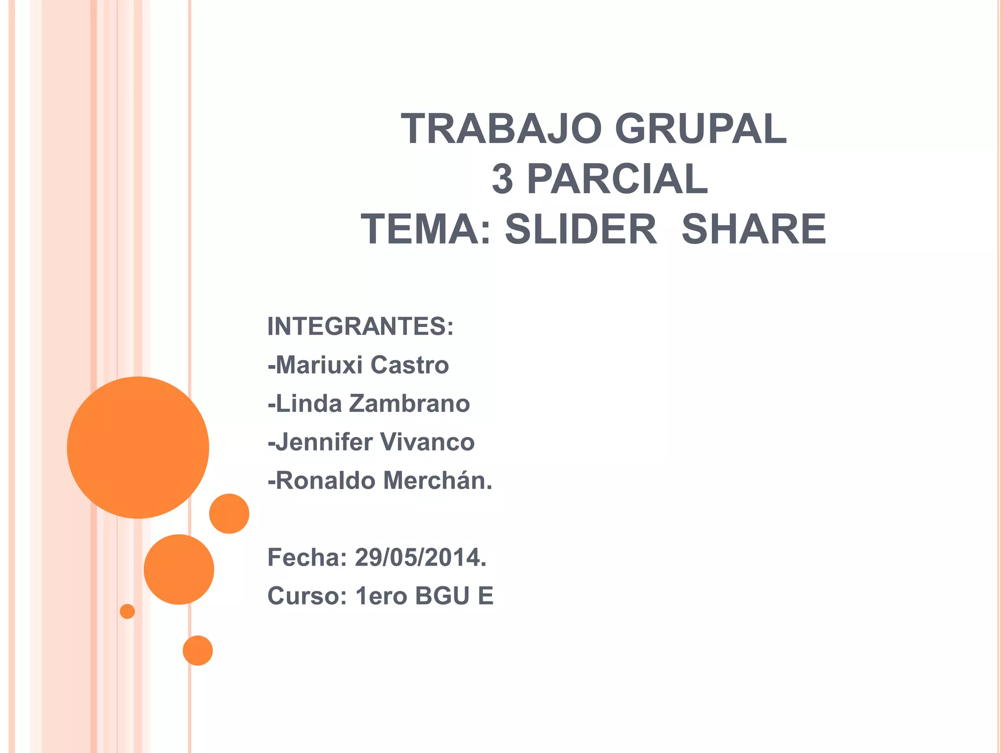 El documento presenta un resumen del tercer parcial del curso 1ero BGU E sobre el tema "Slider Share". El trabajo fue realizado por un grupo compuesto por Mariuxi Castro, Linda Zambrano, Jennifer Vivanco y Ronaldo Merchán. Slider Share es un servicio gratuito en línea para compartir presentaciones de PowerPoint, documentos PDF y videos de hasta 20MB. Los usuarios pueden almacenar archivos registrándose o con su cuenta de Facebook. Sirve como canal de comunicación entre clientes y proveedores para compartir presentaciones sin necesidad de adjuntar archivos pes