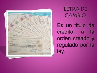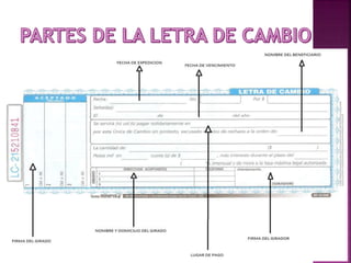 El documento resume los aspectos fundamentales de una letra de cambio, incluyendo sus integrantes, características legales, avalistas, endosos y modos de vencimiento. Una letra de cambio es un título de crédito regulado por ley que permite la transferencia de deuda de una persona a otra y debe incluir elementos como el monto, fecha de vencimiento, nombre del librado y firma del librador.