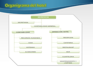 Este documento presenta el plan de marketing de un hotel y casino llamado "Garza Hotel & Casino". Incluye una descripción general del hotel, su misión, visión y servicios. También analiza factores internos como logística, operaciones, ventas, finanzas, sistemas, recursos humanos y abastecimiento. Finalmente, evalúa fortalezas, debilidades, oportunidades y amenazas, y propone estrategias de publicidad y promoción.