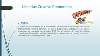 Este documento describe las licencias Creative Commons, incluyendo su origen en el movimiento de software libre y sus características principales. Ofrece seis combinaciones posibles de licencias que permiten diferentes niveles de uso comercial, modificación y distribución de obras derivadas. Finalmente, explica que cada licencia Creative Commons consta de tres códigos: legal, humano y digital.
