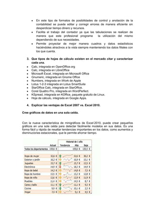 Este documento presenta el trabajo grupal de NTICs 2 realizado por Paola Salas y Renato Carrasco. El grupo consultó definiciones de hoja de cálculo y preparó la suya propia. Luego explicaron los principales usos de las hojas de cálculo en contabilidad e identificaron diferentes tipos de hojas de cálculo disponibles en el mercado. Finalmente, compararon las ventajas de Excel 2007 vs Excel 2010.
