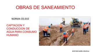 Este documento presenta la norma OS.010 sobre captación y conducción de agua para consumo humano. Establece los requisitos mínimos para el diseño de sistemas de captación y conducción de agua en localidades mayores a 2000 habitantes. Incluye secciones sobre fuentes de abastecimiento, captación, conducción y consideraciones especiales para cruces de vías y protección contra golpes de ariete. También presenta la norma OS.020 sobre diseño de plantas de tratamiento de agua, la cual establece criterios básicos para el desarrollo de