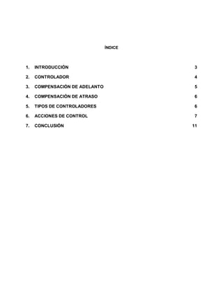 Este documento describe los conceptos básicos de los controladores y las diferentes acciones de control. Explica que un controlador detecta los desvíos entre el valor medido y el valor deseado, emitiendo una señal de corrección al actuador. Luego describe los tipos de controladores P, I, D, PI, PD y PID, y cómo cada uno usa la señal de error de manera diferente para lograr el control. Finalmente, explica cómo las acciones combinadas de un controlador PID aprovechan las ventajas de cada acción individual para lograr un control más preciso y est