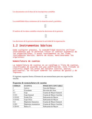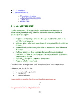Este documento describe los conceptos básicos de la contabilidad y sus principales instrumentos. Explica que la contabilidad registra las transacciones de una organización para proporcionar información financiera y apoyar la toma de decisiones. Luego describe los tres principales tipos de activos - circulantes, fijos y otros activos - y explica cómo se clasifican y definen cada uno. Finalmente, resume que los activos totales de una organización son la suma de sus activos circulantes, fijos y otros activos.