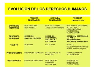 Este documento describe la evolución de los derechos humanos a través de las distintas generaciones, desde los derechos civiles y políticos de la primera generación hasta los nuevos derechos de la tercera generación como el derecho al desarrollo, a la paz y al medio ambiente. También presenta diferentes teorías sobre los derechos humanos y clasificaciones de los mismos, así como índices y mediciones que han sido utilizados para evaluar el respeto a los derechos humanos en distintos países. Finalmente, destaca la cone