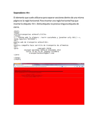 El documento habla sobre cómo insertar comentarios, saltos de línea y separadores en código HTML. Explica que los comentarios se insertan entre las etiquetas <!-- y //-->, que para un salto de línea en el navegador se usa la etiqueta <br>, y que para una regla horizontal de separación se usa la etiqueta <hr> sin etiqueta de cierre.