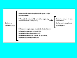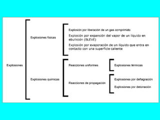 El documento trata sobre conceptos fundamentales de las explosiones. Define una explosión como la liberación súbita de un gas a alta presión en el ambiente. Explica que pueden ser explosiones mecánicas, causadas por la expansión de un gas comprimido, o químicas, causadas por reacciones químicas exotérmicas que generan gases. También describe diferentes tipos como deflagraciones, detonaciones, explosiones de recipientes y de atmósferas inflamables.